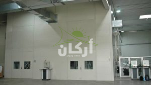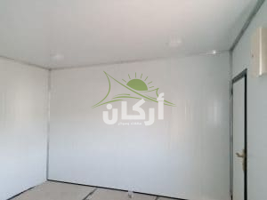 - ثم يبدأ تركيب الجدران على حسب نظام الشخص والذي يتعلق بألواح الساندوتش بانل سمكه 10 سم ومغطى من الداخل والخارج بألواح مجلفنة سمكها 0, 5 مم، وفي الوسط يوجد طبقة من الرغوة بكثافة (2 إلى 40) كجم/م3.